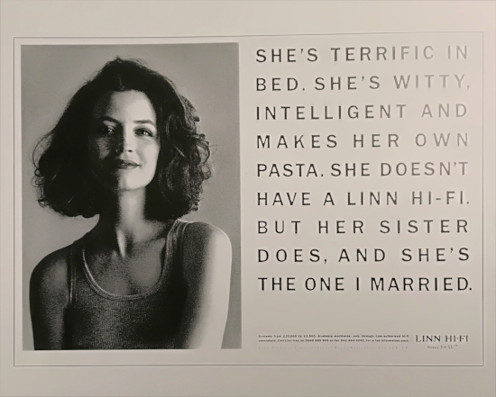 Linn Hi Fi; Marr Associates, Edinburgh. In: Saunders, Dave (1996) Best Ads: Sex in Advertising. Batsford, p.58.